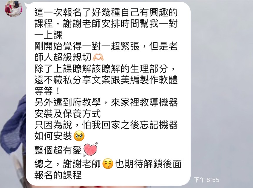 這一次報名了好幾種自己有興趣的課程,謝謝老師安排時間幫我一對一上課